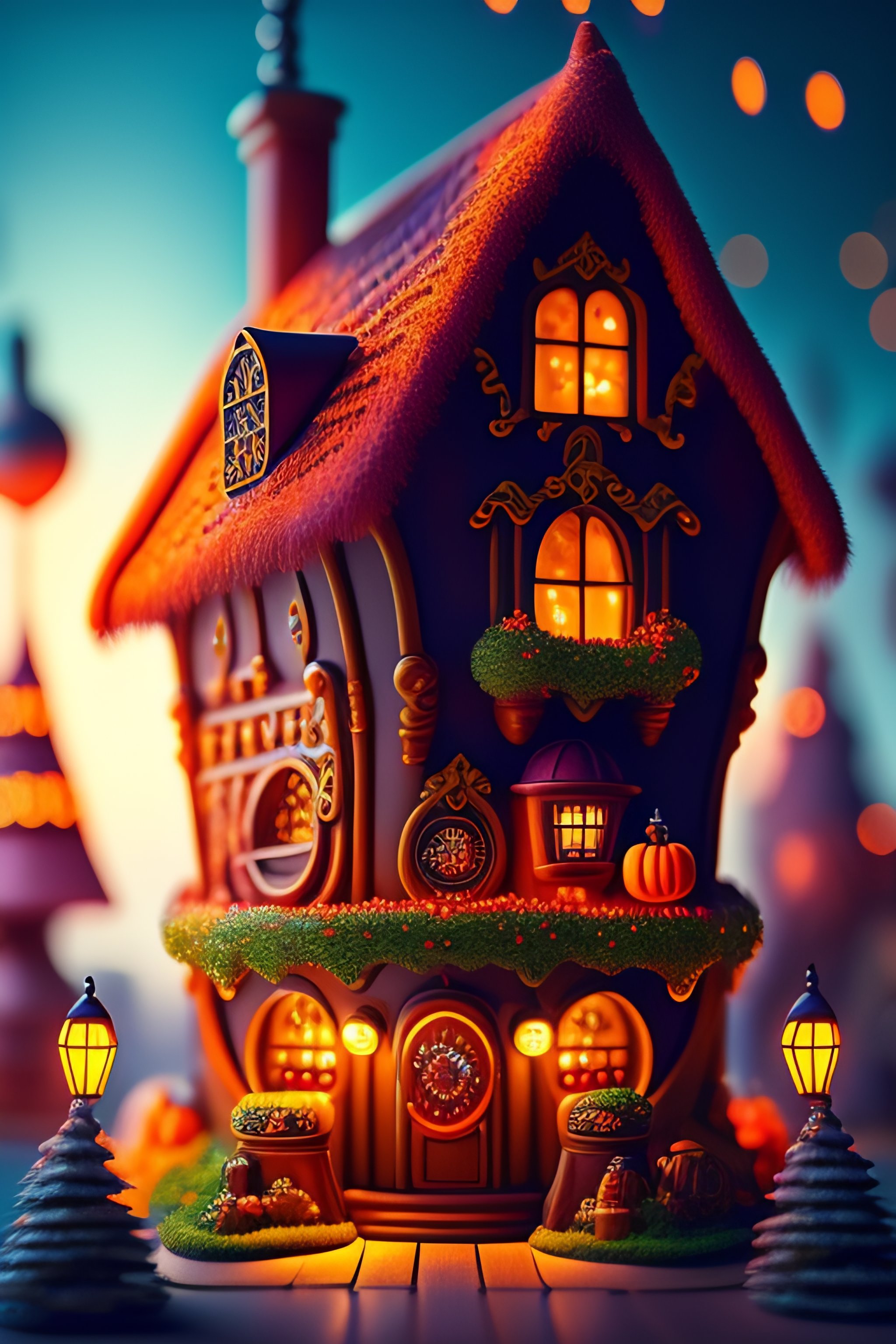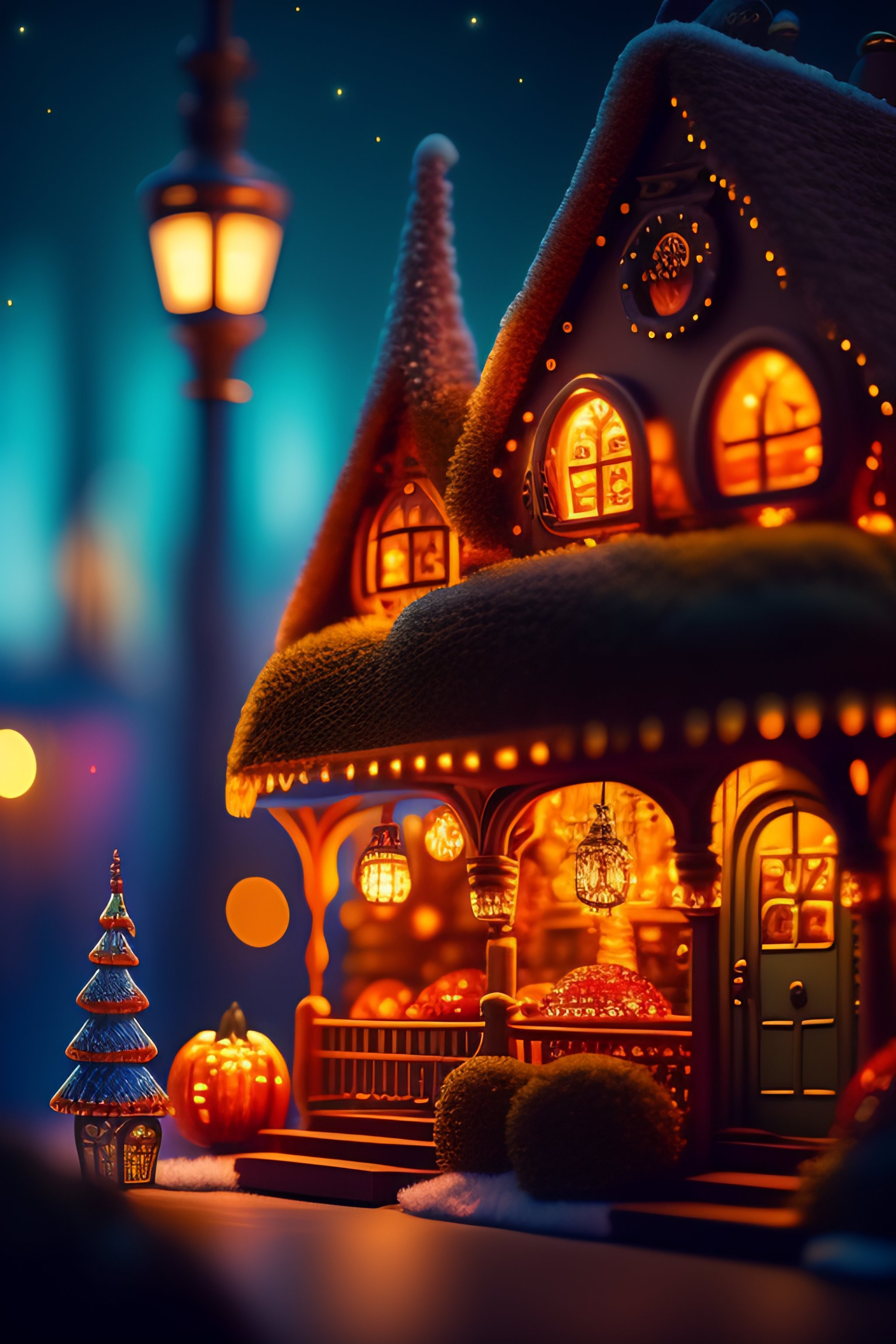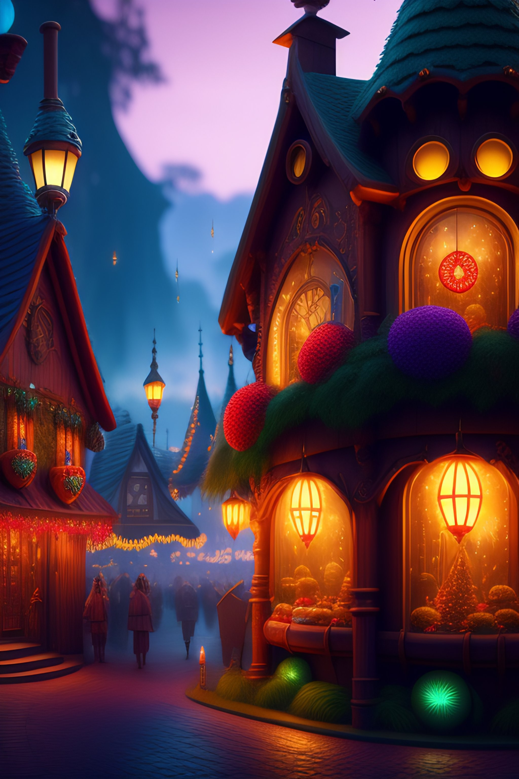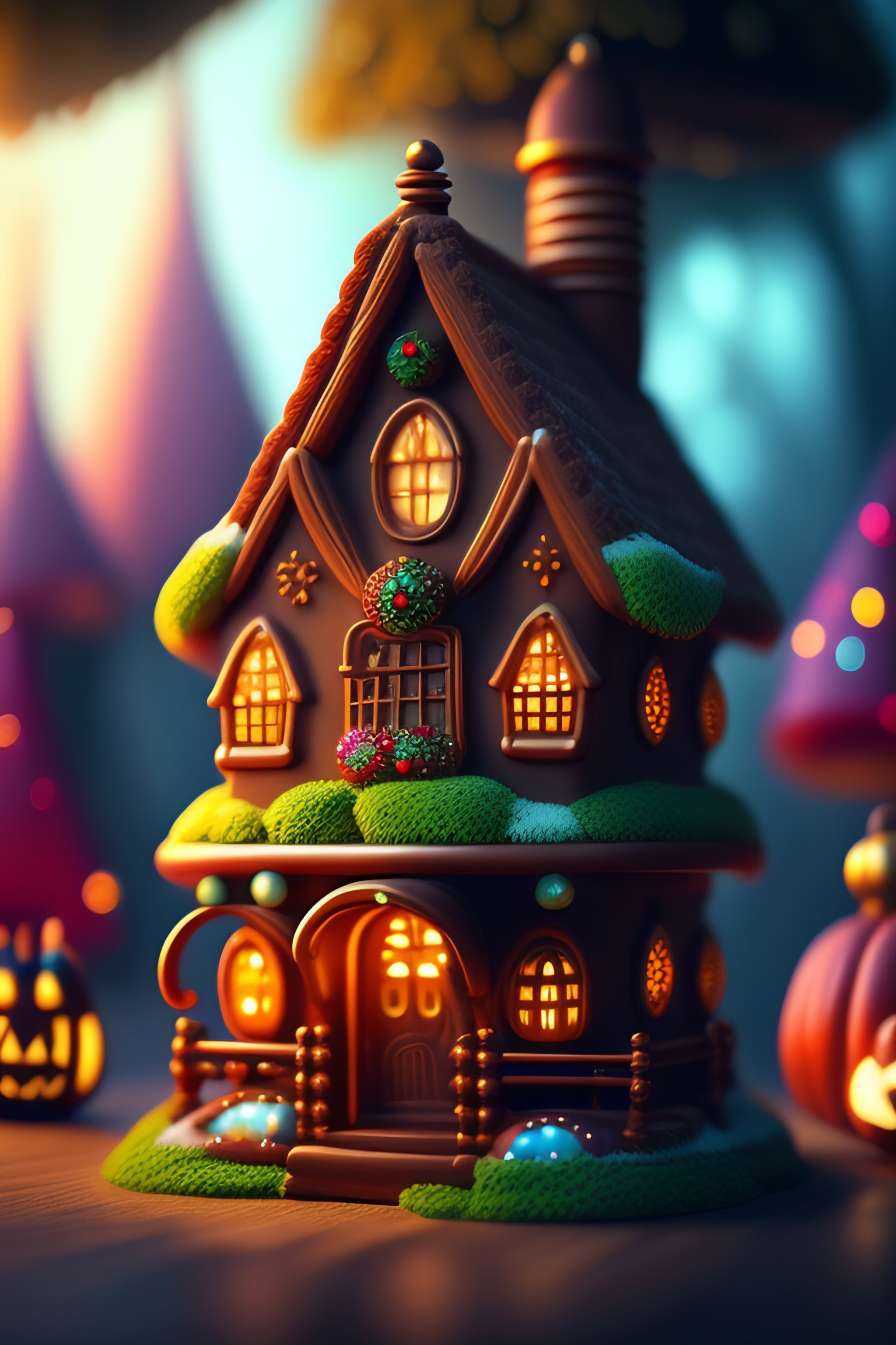 gingerbread candy village, steampunk, cinematic scene, art deco, studio lighting, robot, colorful, inspectorcore, fantasy, fairytale, intricate, forest, fireflies, flowers, halloween, christmas, hansel and gretel, background blur, bokeh, medium shot, visually stunning, matte painting, concept art